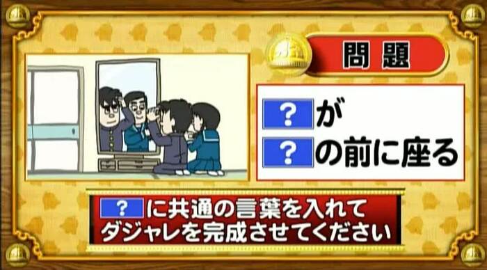 次は、ダジャレ穴埋めの問題。「?」に共通する言葉を入れてダジャレを完成させよ。