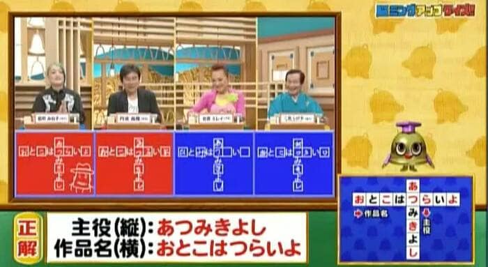 正解は「あつみきよし」と「おとこはつらいよ」。能町と丹波の2人が正解!