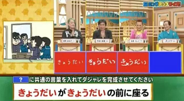 正解は「きょうだい(兄弟が鏡台の前に座る)」。能町、丹波、北原の3人が正解!