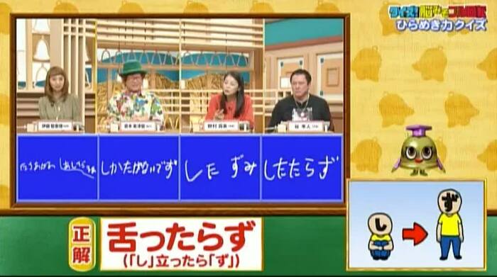 正解は「舌ったらず(『し』立ったら『ず』)」。「したたらず」と回答した谷は惜しかったが、正解者ゼロ!