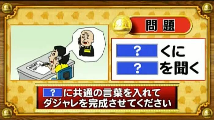 最初は「脳ミングアップクイズ」から、ダジャレ穴埋めの問題。「?」に共通する言葉を入れてダジャレを完成させよ。