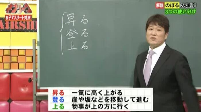 「日がのぼる」を漢字でどう書くか答える問題では、現代文担当の林修先生が解説を加えてくれた。「のぼる」は「昇る」「登る」「上る」と書くことができるが、それぞれ使い方が違うという。