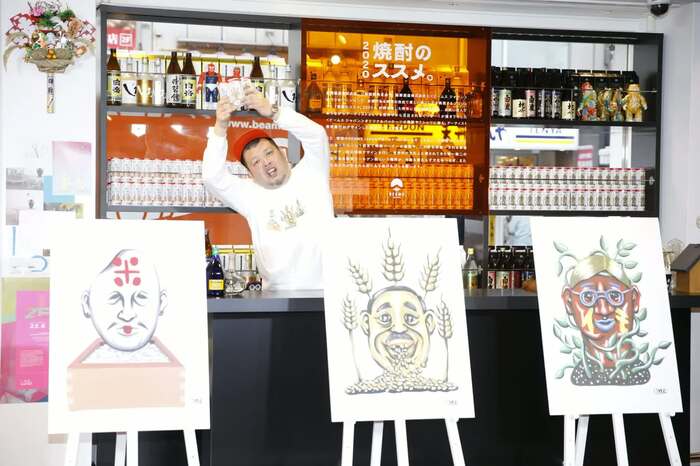 芋焼酎は、「芋ですね、まさに芋。芋だけ神的な要素がなかったんで、ただの人民を描きました」とシンプルに描いたこと語り、「でも芋は愛されてるじゃないですか、芋焼酎って女子も飲むでしょ?まぁ全部飲みますけど」とフォローした。