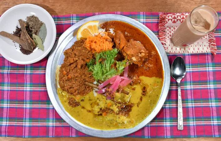 スリランカ豆カレーを口に運び「何このプチプチ?」と食感を不思議がる松岡に、「マスタードシードです、スパイスがたくさん入っています。クミン、ガーリックも」と笑顔の宮川さん。