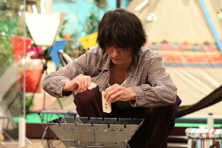 まずは山﨑が火起こしに挑戦。国分の指導で、あらゆるグッズを駆使して起こそうとするも苦戦。汗だくで火種に向かう山﨑に国分が「キャンプ楽しい?」と聞くと、「この大変さが楽しいっす」と必死な表情を浮かべた。