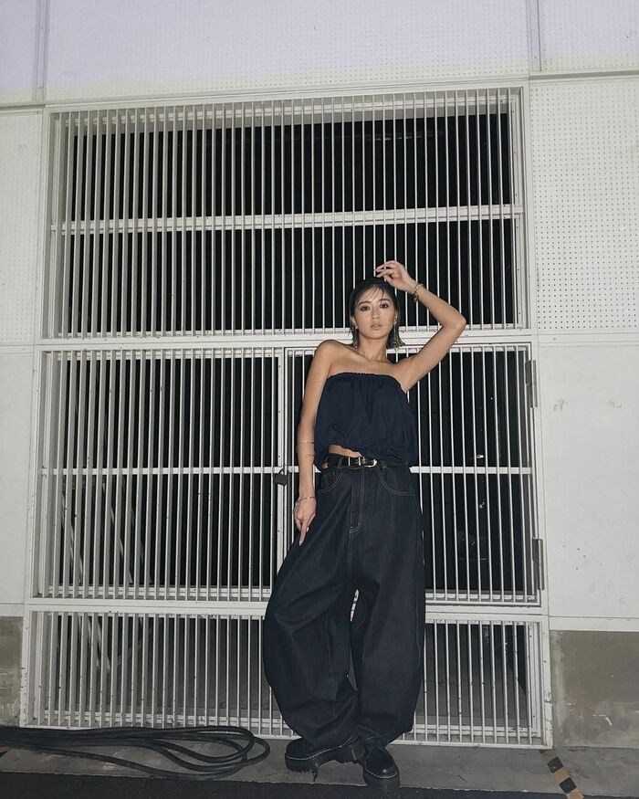 ネイビーのチューブットップにワイドデニムパンツでクールに決めたショットも披露しました。