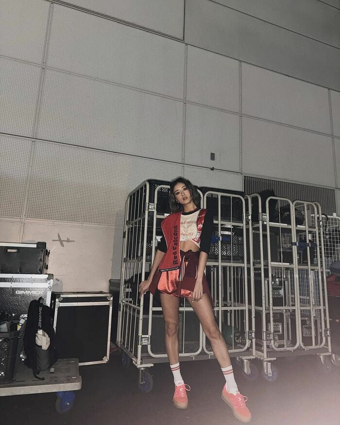 さらには、ロンTのすそをまくって短めに結び、ショート丈のボトムを合わせた姿も公開。