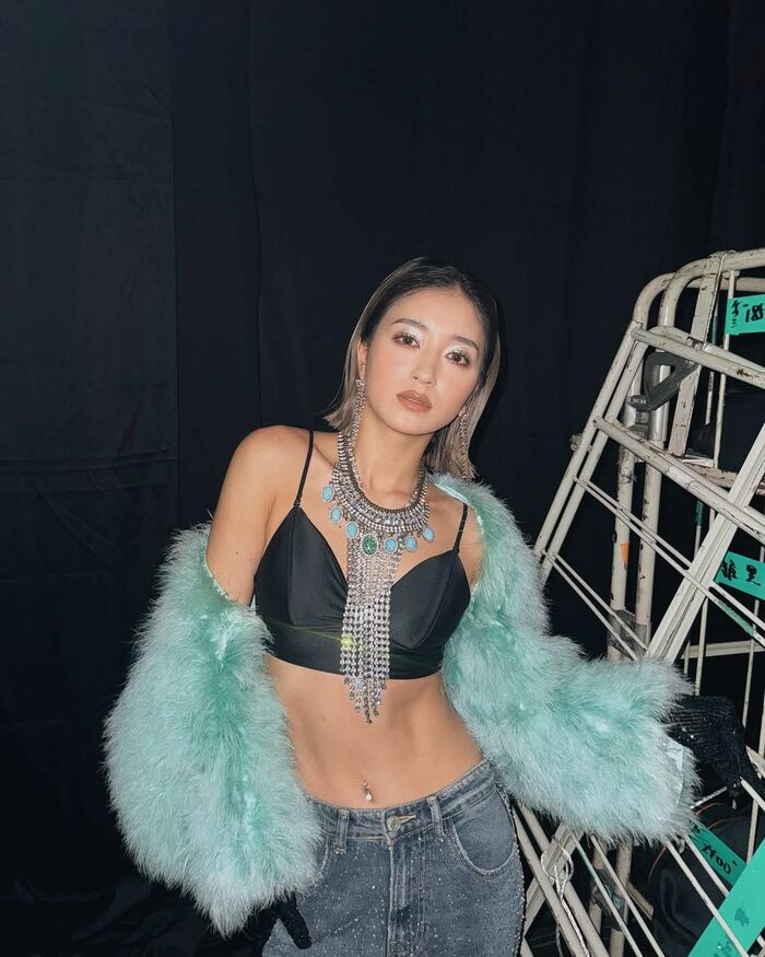 かなり短いトップスからは、鍛え上げられたみちょぱさんの美腹筋があらわになり、おへそにはピアスがキラリと輝いています。