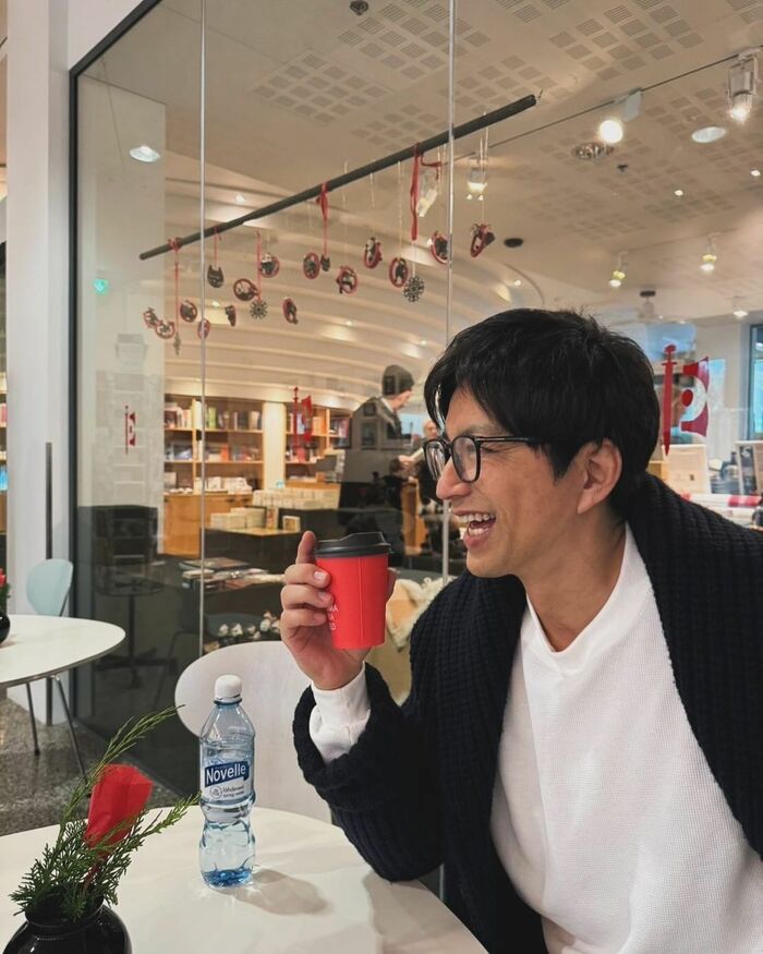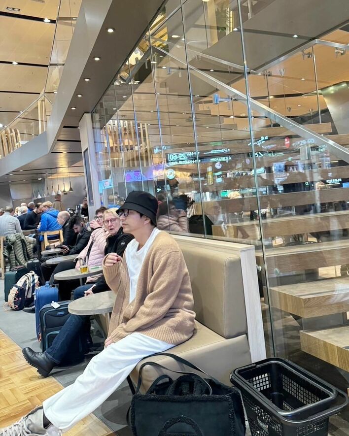 投稿された写真には、白いTシャツ、白いパンツにベージュのカーディガン、黒い帽子に黒縁メガネをかけイスに座り、どこか遠くを見つめる様子や・・・