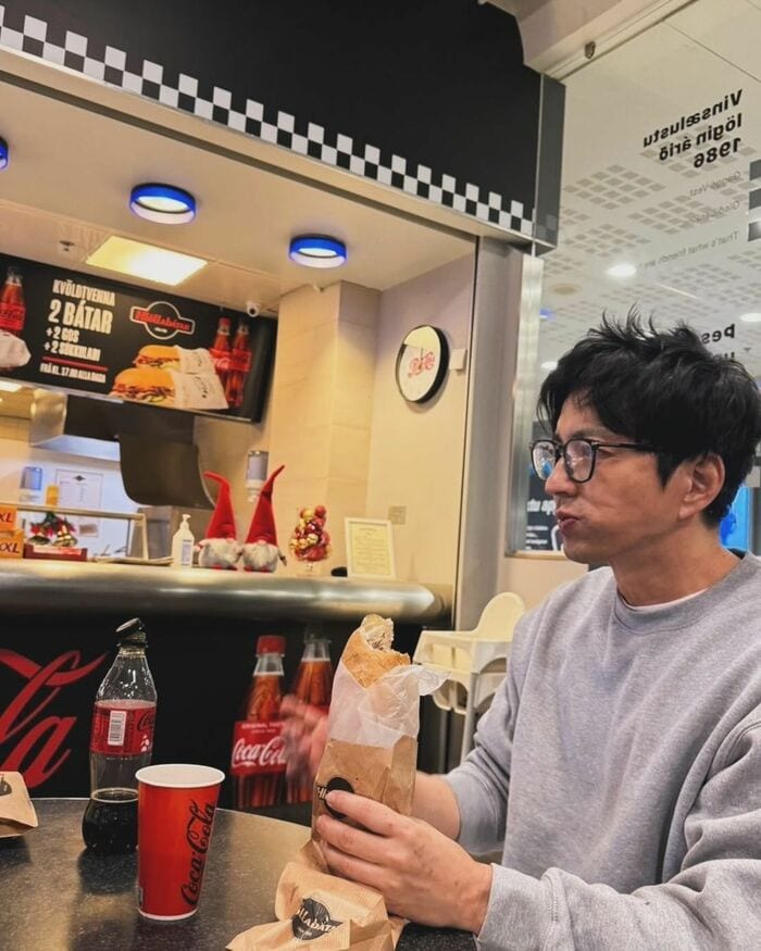 海外でグレーのトレーナーに、黒縁メガネをかけ、髪の毛が少しはねた姿で、サンドイッチを頬張るショットや・・・