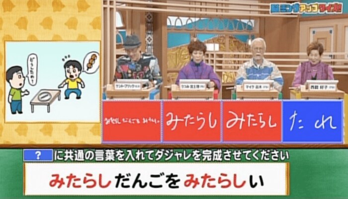 西舘好子さんの回答は「たれ」で、不正解。ケント・フリックさん、うつみ宮土理さん、マイク眞木さんが正解でした。