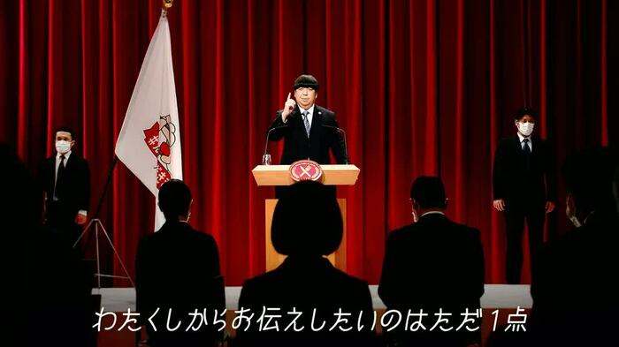 同行したSP役がステージ前で離れると、壇上に向かって一礼し、ゆったりとした足取りで演説台に上がった日村。