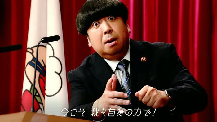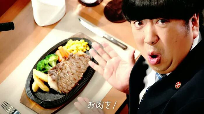 「会見」篇では、記者会見の会場に登場した日村が神妙な面持ちから一転、朗らかな表情で「肉食ったら日本救えるんだぜ!」と高らかに宣言。