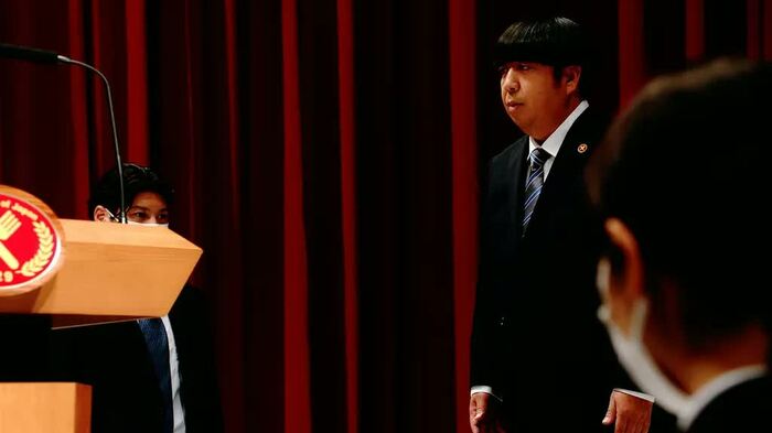 真顔から決めゼリフ、そして再び真顔に戻る一連の緩急の付け方や、見る人を引き付ける“タメ”の使い方、会見の緊張感を生み出す細かい目線の運び方が絶妙で、OKテークを連発したという。