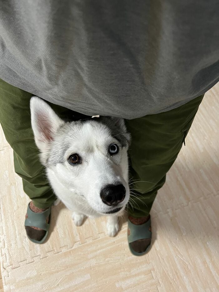 ある日には、飼い主にぴったりくっついて、足の間から顔をひょっこり!