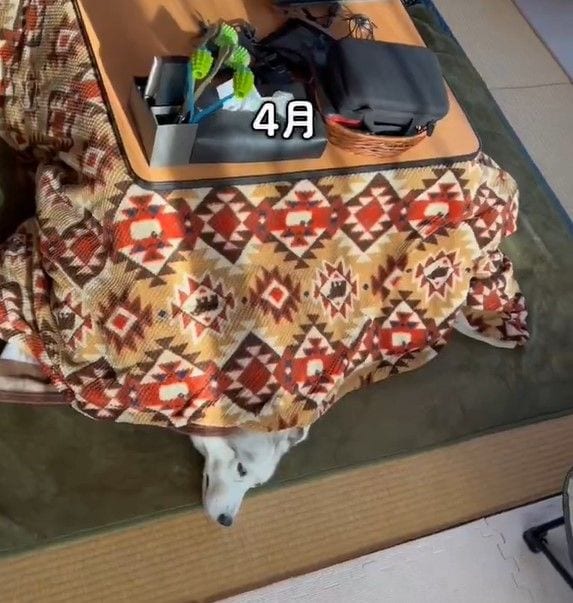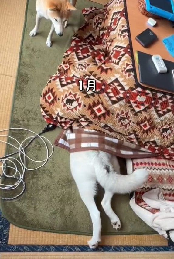 一緒に暮らしているワンちゃんも、「いつこたつから出るんだろう…?」と不思議そうな表情で少し離れたところから見守っています。