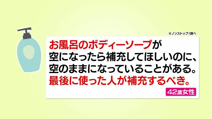 ボディソープが空になっても詰め替えをしてくれないという話題では、菊地さんが「夫が詰め替えパックから直接使っていて、腹が立った」と体験談を語りました。