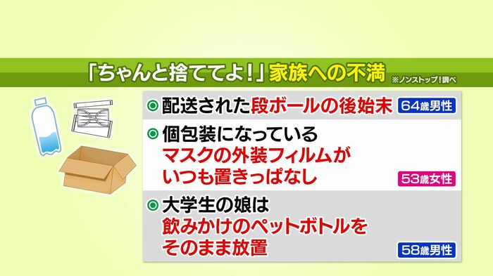 番組公式SNSには「箱アイスの箱」「箱ティッシュの外装フィルム」など、放置されがちなゴミの例が寄せられ、「昔はいちいち指摘していたけれど、今は妥協している」「一人暮らしだと思って全部自分でやっている」などの愚痴も届きました。