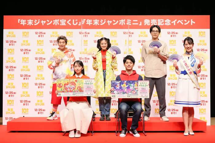 「年末ジャンボ宝くじ」と「年末ジャンボミニ」が11月24日(火)より全国で同時発売されることを記念して、「『年末ジャンボ宝くじ』『年末ジャンボミニ』発売記念イベント」が同日開催。CMキャラクターを務める妻夫木聡、吉岡里帆、成田凌、矢本悠馬、今田美桜が登壇した。