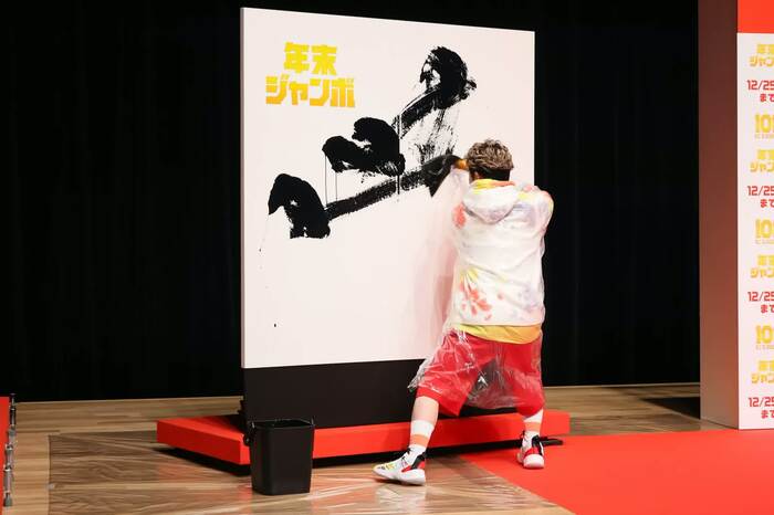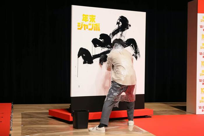 妻夫木が、最後の「夕」のバランスを確認しようと、ボードを手でなぞると、手に墨がついてしまい、思いがけず“下書き”をしてしまうという小さなハプニングが。ばつの悪そうな顔をしながら、なんとか妻夫木が「夕」を書き入れ、「夢」の一字が完成した。