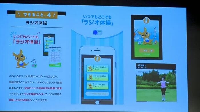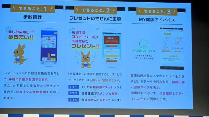 「すこやかんぽ」では、毎日の歩数管理や、歩数に応じてコンビニで使えるクーポンへの抽せんへの応募権、健康診断結果を元にしたアドバイス、いつでもどこでもラジオ体操が出来るといった、普段から健康を意識できる機能が備わっている。