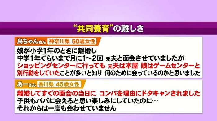 「離婚後の子育て…再婚したらどうなる?」のテーマでまず紹介されたのは、10月放送の「共同養育」の議論を受けて寄せられた、視聴者のエピソードの数々だ。