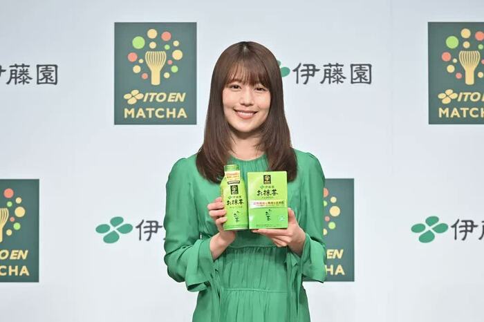 緑一色のワンピース姿で現れた有村は「お抹茶ということで、グリーンのお茶っぽいイメージの衣装を選びました」と説明。