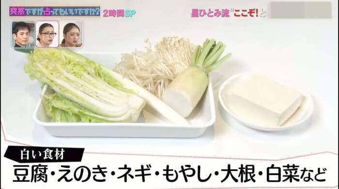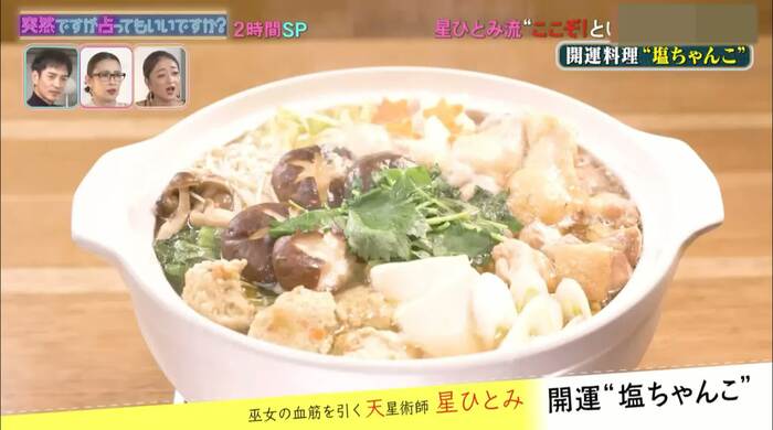 星ひとみは「自分の気を整える」ための開運料理を紹介。中国古代の学説「五行説」に基づき、今年の開運食材となる「金」の食材で「塩ちゃんこ」を作ると運気がアップすると勧めた。