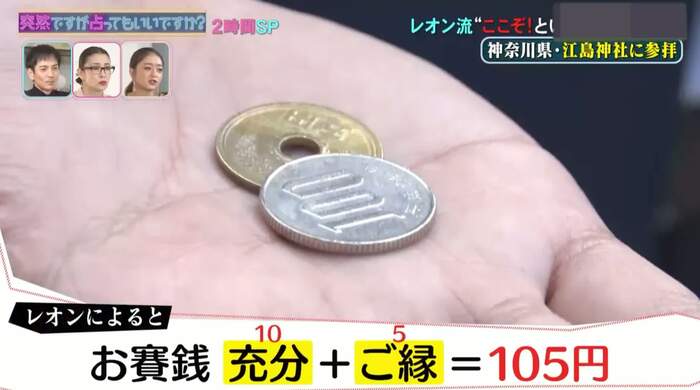レオンによれば、賽銭は「十分(=10)にご縁(=5)がありますように」という願いを込めて、105円がベスト。祈願時には自分の住所・名前を神様に伝えるとご利益が届きやすいという。