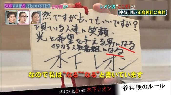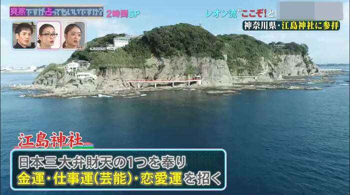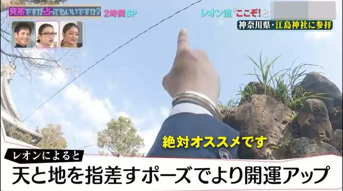 占い師・木下レオン流の「開運行動」は、<江島神社(神奈川県・江ノ島)に参拝すること>。この神社は日本三大弁財天の1つを奉り、金運や恋愛運などを高めてくれるそう。木下自身も1年前に江島神社に参拝してテレビでの活躍を祈願したところ、『突然ですが占ってもいいですか?』でのレギュラー出演がかなったそうだ。