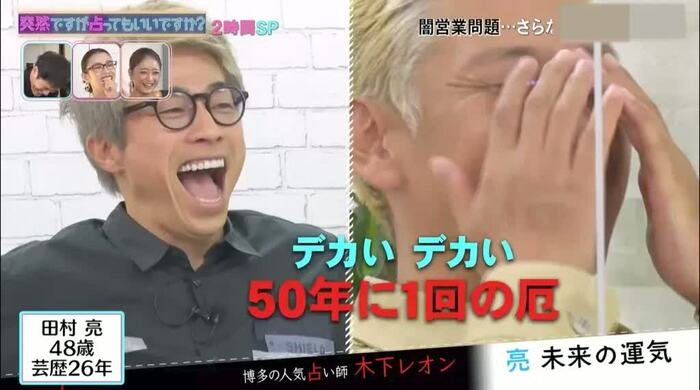 “闇営業問題”について激白したロンブー亮には「52歳で、人生最大の厄が来る。50年に一度の厄に入る」と衝撃の予測が告げられたほか、既婚者の昴生は浮気を見透かされピンチに追い込まれ、亜生は「お兄ちゃん(=昴生)に泣きながら電話したんですよ」という過去を明かし、高橋姉妹は“一家の経済面を背負う”覚悟をしたという10代での苦労を語った場面も。