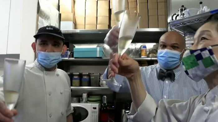 週末の夜、閉店時間の10時半を過ぎても、客足が途絶えることはなかった。ラストオーダーを出し終わると、営業中でも従業員はシャンパンで乾杯。