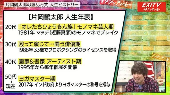 ここで、「片岡鶴太郎 人生ヒストリー!!」と題して、『ザ・ノンフィクション』もびっくりな片岡の波乱万丈すぎる人生年表が紹介された。