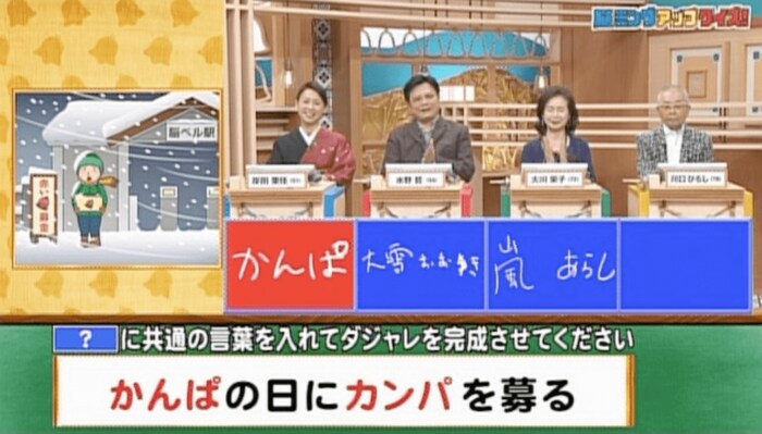 水野哲さんは「大雪/おおゆき」、大川栄子さんは「嵐/あらし」、川口ひろしさんは白紙で回答し不正解。岸田里佳さんだけが正解でした。