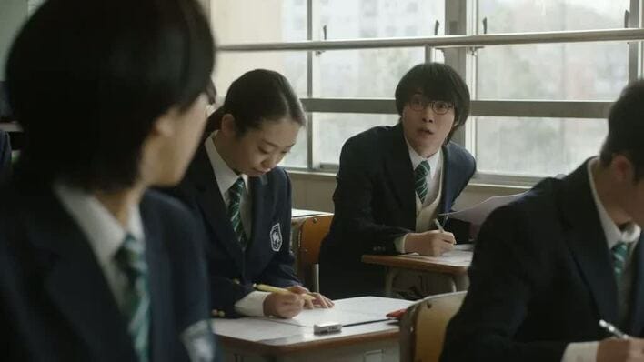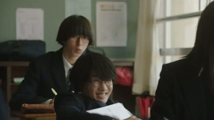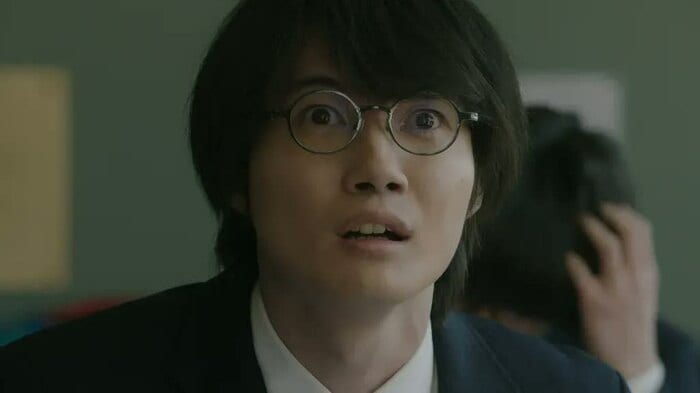 テストの解答を見直していると、見覚えのある文字が並んでいることに気づいた高杉くんと松本さん。2人は「これは」「貯杉先生からの…」と顔を見合わせ、貯杉先生の方へ目を向けると、色気たっぷりに「メッセージ」とつぶやく貯杉先生。