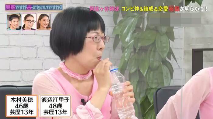 恋愛よりも美穂との阿佐ヶ谷姉妹を優先する決断をした江里子だったが、2人の手相を見た星は「すごい!」と拍手。「夫婦同士にしか入らない線が出ている。現世ではずっと一緒にいます。来世だと必ず結ばれます!」と宣言した。相性の良さが占いでも裏づけられる結果に涙ぐむ江里子をよそに、ドライな性格の美穂は真顔で水を飲んだ。スタジオの水野は「阿佐ヶ谷姉妹じゃなくて、『阿佐ヶ谷夫婦』だったんですね!」と振り返り、今回のVTRを楽しげに総括した。