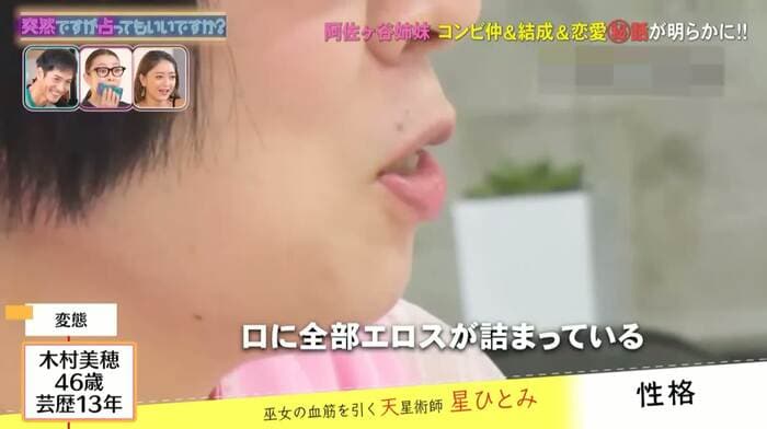 一方の美穂は、番組VTRをスタジオで見守る沢村一樹と同じく“変態の星”が入っていると診断。星が「お口に全部エロスが詰まっている。キスの練習をしなくても上手いタイプ」というと、2人は「最高じゃない」と反応。フェロモンや色気、愛情をたっぷり出すと美穂の仕事運が上昇するそうだ。
