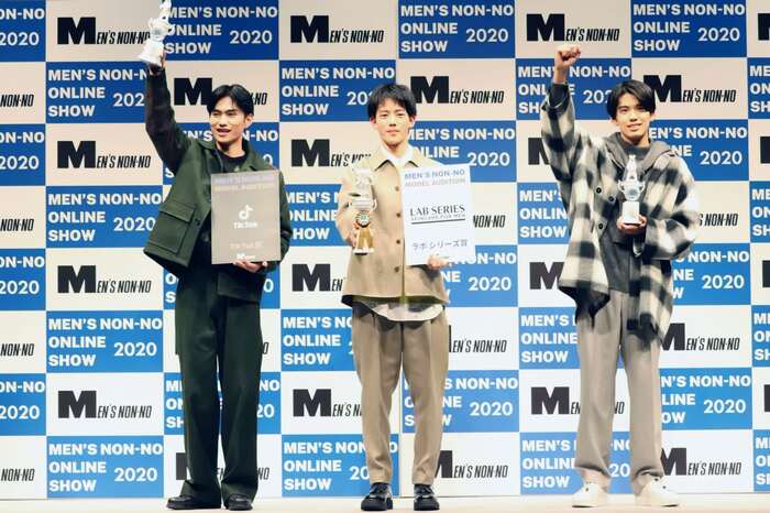 「第35回メンズノンノモデルオーディション」で3000通をこえる応募の中から選ばれたのは3人。グランプリと「ラボ・シリーズ賞」のW受賞を、樋之津琳太郎(ひのつ・りんたろう)が、準グランプリを稲井孝太朗(いない・こうたろう)が、そしてTikTokを通して応募した人の中から選ばれる「TikTok賞」を、大平修蔵がそれぞれ獲得した。