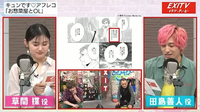 兼近と岡本がこの「じれったい系年の差25歳ラブ」コミックのアフレコに挑戦する。平凡なOL・楪(ゆずりは)がいつも行く惣菜店の田島さんに不意に告白される胸キュンシーンを演じると、兼近はなぜかノドを絞りながら、平泉成のような口調でアフレコをする。