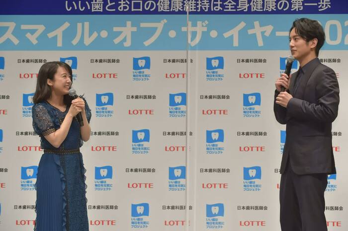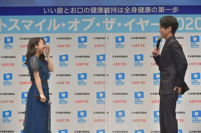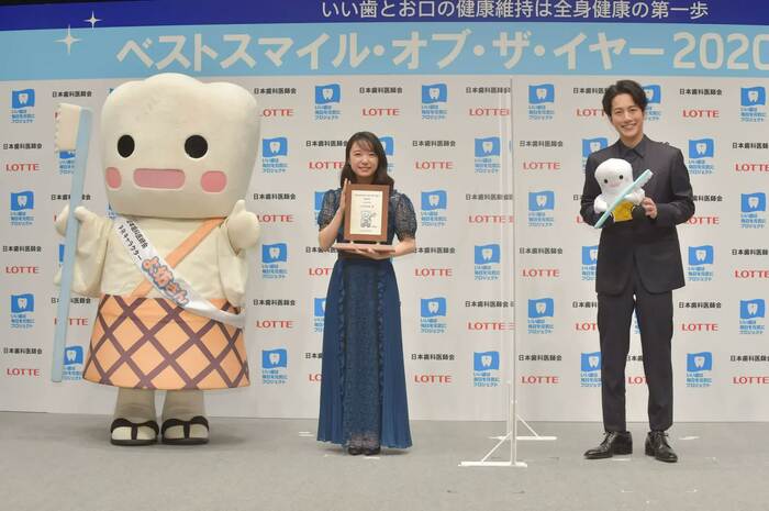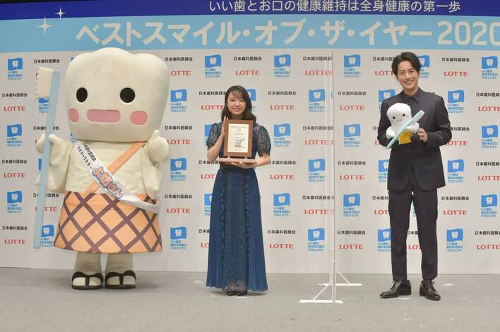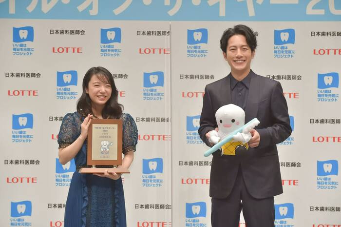「いい歯は毎日を元気にプロジェクト」実行委員会が選出する最も笑顔が輝いている各界の文化人・著名人として表彰された上白石と溝端。