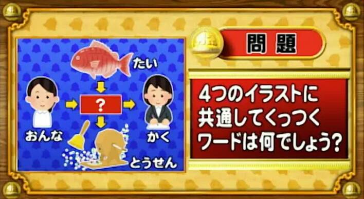 最初は「脳ミングアップクイズ」から、くっつきワードの問題。次の4つのイラストに共通してくっつくワードを答えよ。