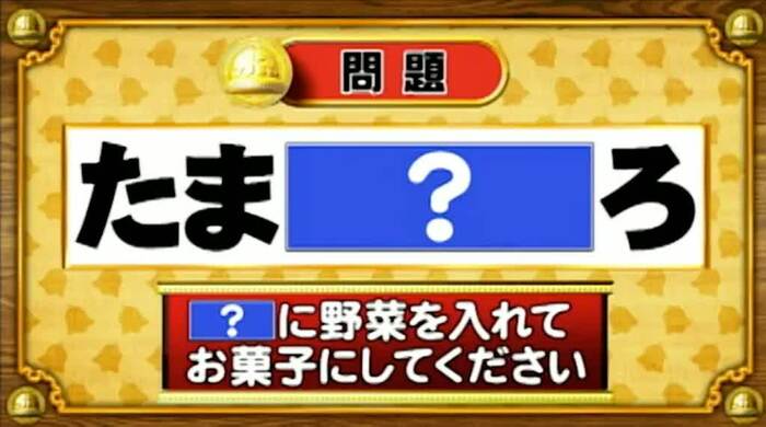 最後は、穴埋めサンドの問題。「?」に野菜を一つ入れて、お菓子にせよ。