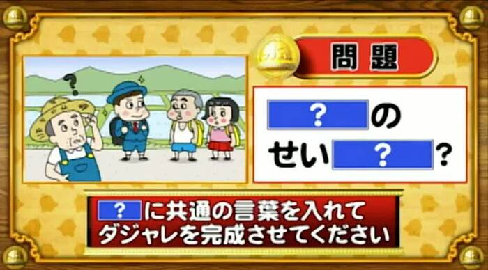 次は、ダジャレ穴埋めの問題。「?」に共通する言葉を入れてダジャレを完成させよ。