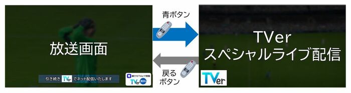 フジテレビの番組を視聴中(スポーツ番組で、放送時間内に試合が終わらない場合など)に 「続きをTVerで視聴」 などの告知テロップが表示されたら「青」ボタンを押下 →TVerテレビアプリが起動し、続きをTVerスペシャルライブ配信で視聴 → 続きが終了すると自動で放送画面に戻ります(「戻る」ボタンでも放送画面に戻ります)。
