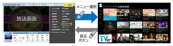 フジテレビを視聴中に「d」ボタンでデータ放送(左上画面)を表示(※) → 「黄」ボタンでメニューを表示して「TVerアプリ」メニューを選択→ TVerテレビアプリが起動し、フジテレビ系の配信番組一覧に遷移 → 「戻る」ボタンで放送画面に戻ります。