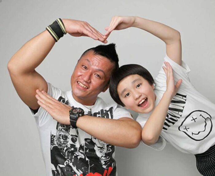 そして、7年後の2025年に撮影した写真では、親子お揃いで赤のギンガムチェックのスーツ姿に蝶ネクタイをつけた2人がカメラに向かってピースをしているショットを披露。