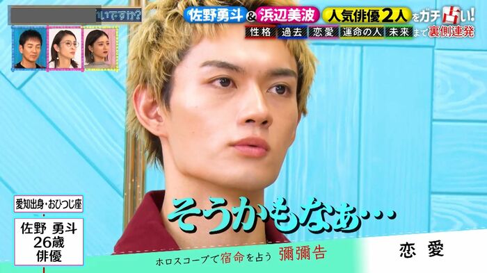 佐野さんは「自分を高めている、頑張っている子に惹かれる」そうで、外見と内面トータルで相手を見ると語りました。彌彌告さんが「自分もしないけど、浮気絶対NG」と告げると、佐野さんは「そうかもなぁ…」と、なんとも言えない表情で反応。
