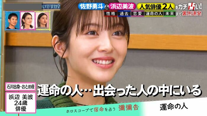 浜辺さんは「縛られるのが大嫌い」と占われると、「自分の時間は、自分でどう使うか決めたい」と答え、「今はお仕事を頑張りたい。友情を育んだり、ペットとの時間にかけたりするほうが今はすごく有意義」と話しました。