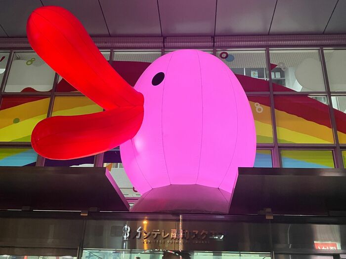 ①正面玄関前の『ハチエモンバルーン』をピンクにライトアップ