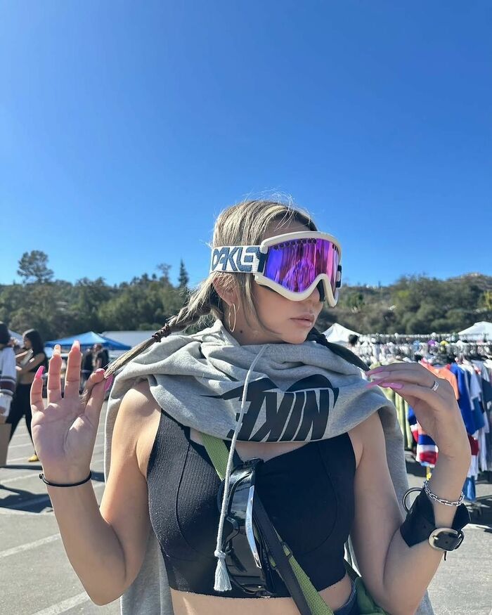 さらに、黒のタンクトップにパーカーを首まで着て、白いフレームのゴーグルをかけたコーディネートに…